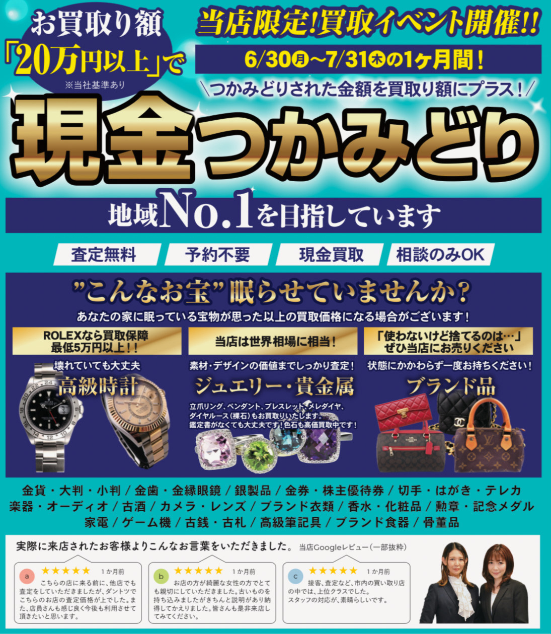 店頭での買取は、直接お会いしての信頼関係の構築が大切ですので、いつでも気軽にお立ち寄りください。